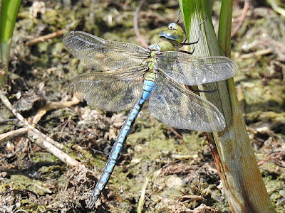 At the Dragonfly ponds I found a male Emperor patroling the lower pond being harassed by a couple of hawkers, one I found in the margin a female Common Hawker ovipositing the other could of been a male judging by the colouration. A few Damsels were present, Blue-tailed, Large Red and Emerald with alot of male and female Common Darters. On one of the other ponds a lone male Broad-bodied Chaser.